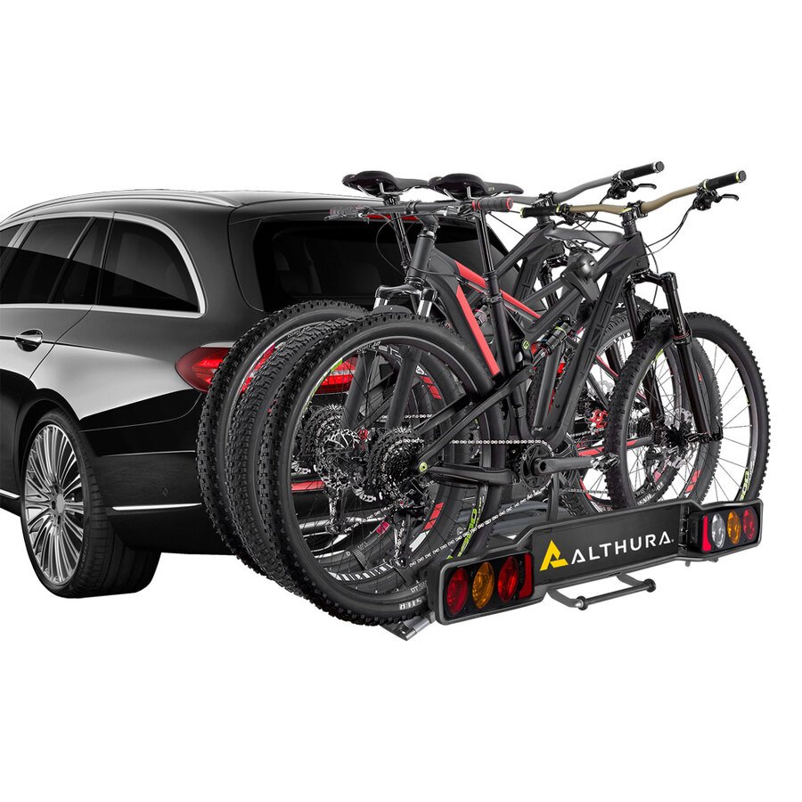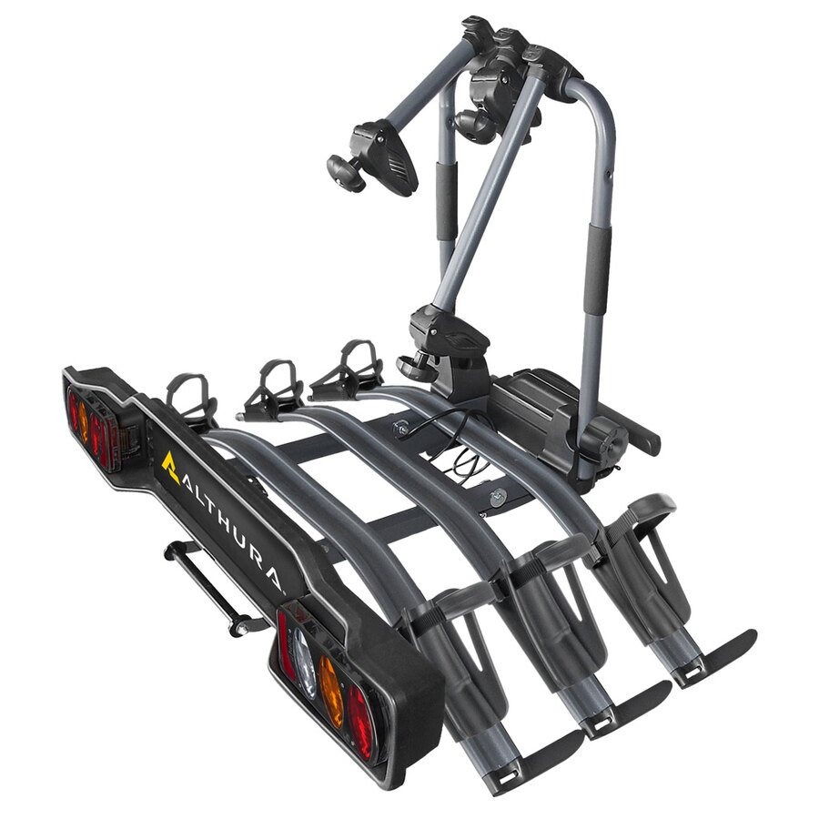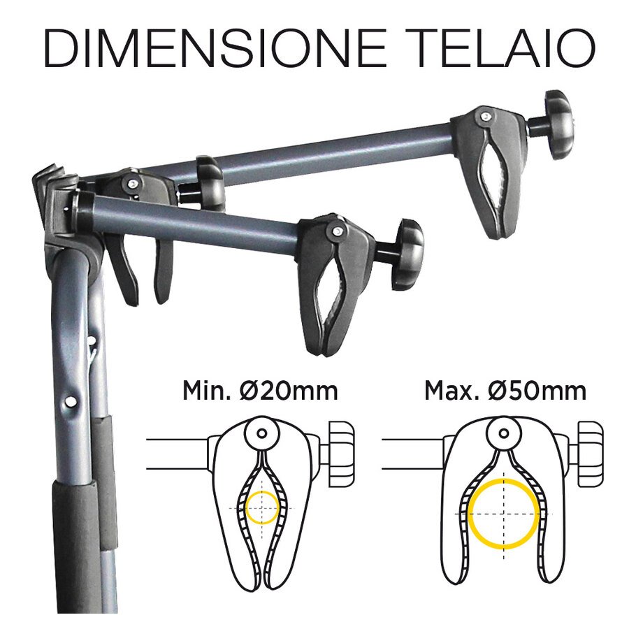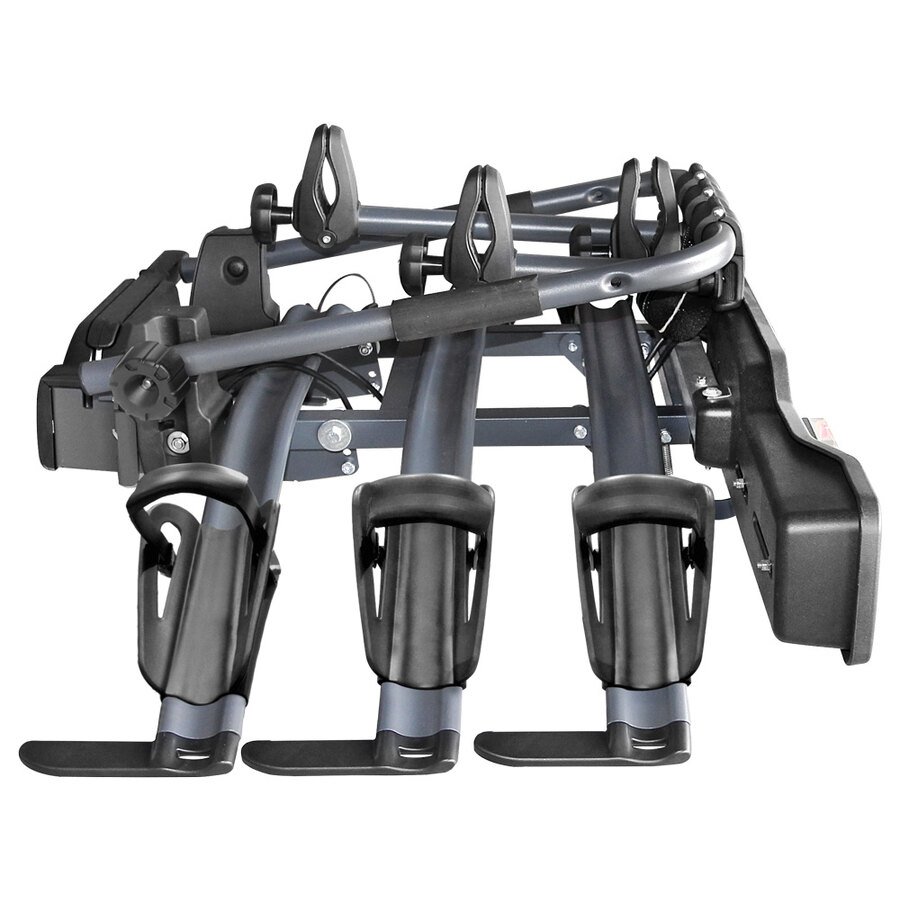 Portabici da gancio traino per 3 bici (carico massimo per bici 20kg, portata max portabici 60 kg). Dotato di un sistema di aggancio e sgancio estremamente compatto e funzionale con sistema antifurto tra portabici e auto. Si inclina mediante l’uso di un pedale per facilitare il carico posteriore. Braccetti distanziatori inclusi. Verniciatura antigraffio. Completo di barra ripetitrice con fanali 13 poli omologati secondo direttiva europea. Binari in alluminio. Compatibile con bici fino a 29″ con interasse massimo 1250 mm. Larghezza massima ruote 70 mm. Omologato secondo direttiva europea.
